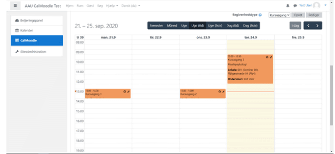 Nu viser skemaet kun de begivenheder, hvor det valgte lokale (her ”001 (Seminar 80), Fibigerstræde 04 (Fib4)”) er tilknyttet (tilsvarende med underviser):