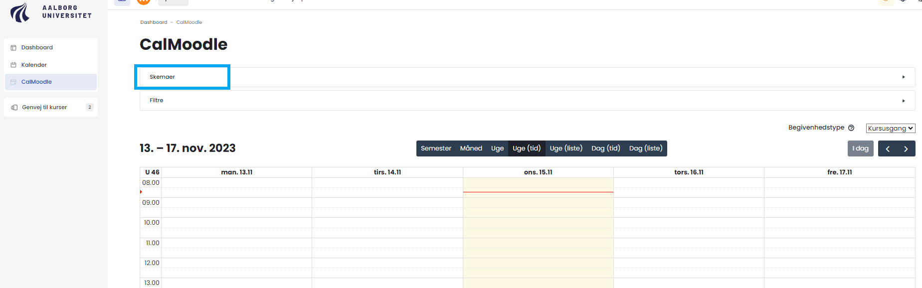 Oprettelse af nyt skemaDu kan her på siden finde vejledninger til hvordan man navngiver skemaer, tilføjer kurser til skema samt hvordan man gemmer sit skema.Oprettelse af nyt skemaDu kan her på siden finde vejledninger til hvordan man navngiver skemaer, tilføjer kurser til skema samt hvordan man gemmer sit skema.Oprettelse af et skema indebærer: Navngivning af skemaet Tilføjelse af kurser og/eller Moodle-grupper. Klik først på menupunktet Skemaer Find skemaer i CalMoodleNavngivning af skemaTilføjelse af kurser til skemaGem skema