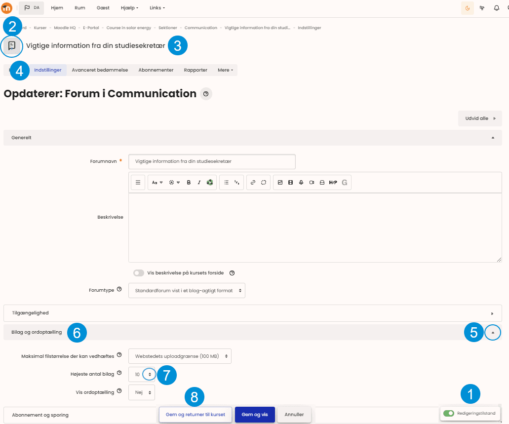 - Vælg den hvid knap Gem og returner til kurset (8) på den svævende menu, i bunden af siden.