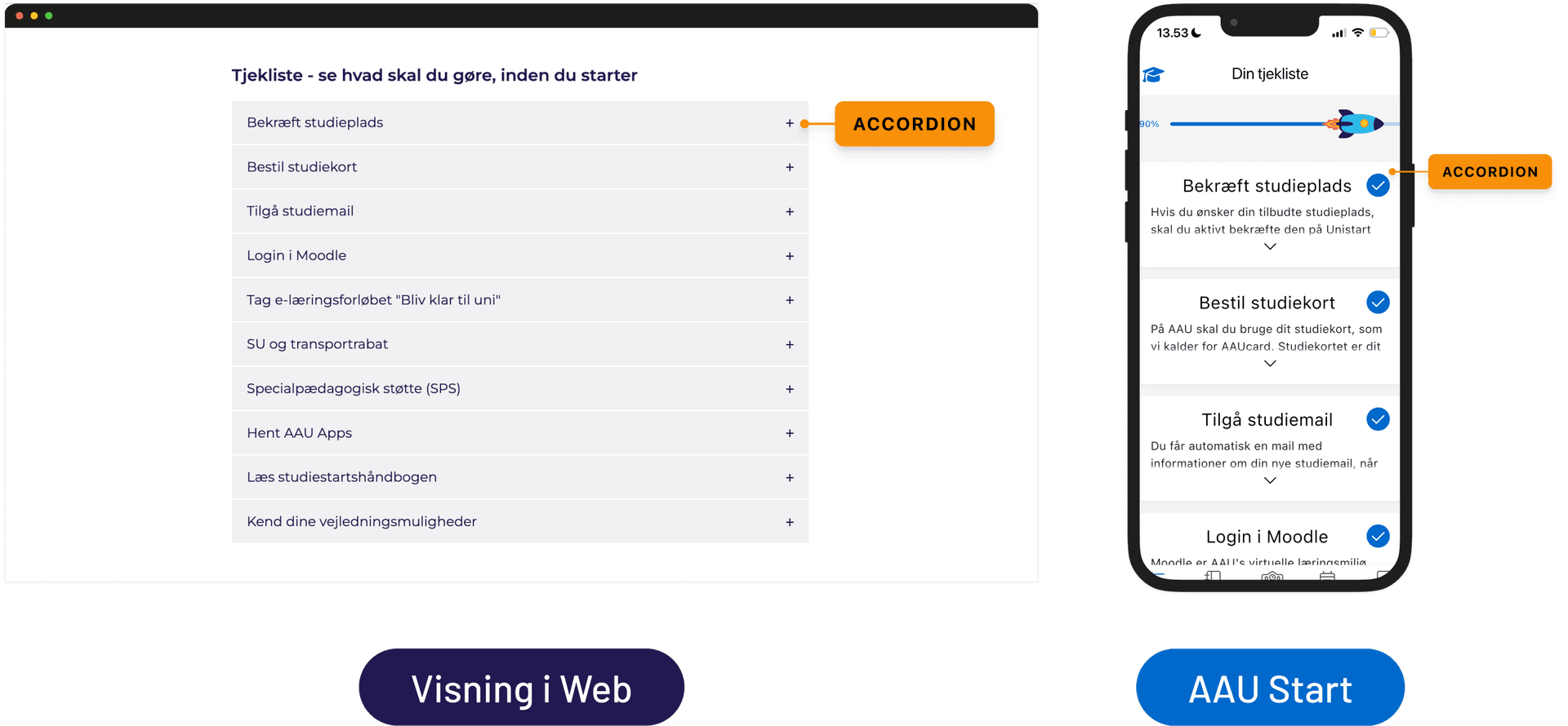 I AAU Start bliver Accordion-indholdet i tjeklisten “Hvad du skal gøre ved studiestart” vist som en interaktiv tjekliste i appen, hvor den studerende kan markere hvert trin som gennemført. Denne visning er kun aktuel i AAU Start og adskiller sig derfor fra den almindelige Accordion-visning. I andre tilfælde kan indhold fra et Accordion også blive vist som sammenhængende tekst.