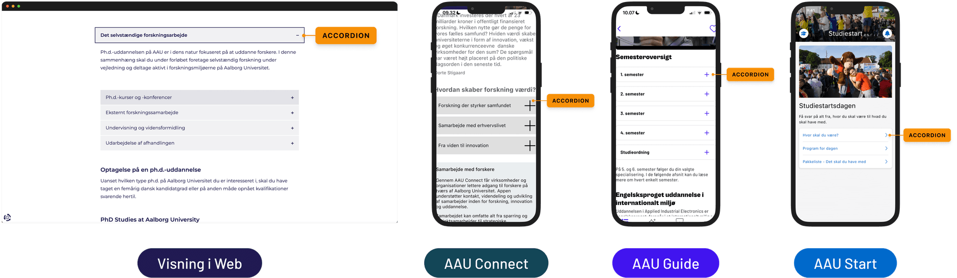 På web vises et Accordion som en liste af punkter, hvor indholdet foldes ud under titlen, når brugeren klikker på den.