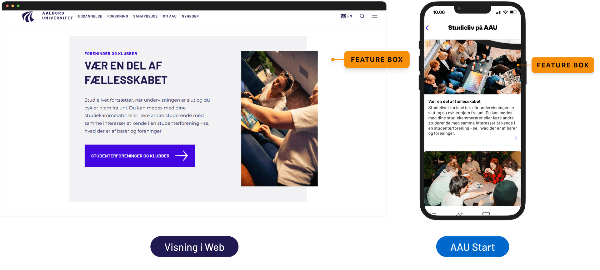 I AAU Start vises Feature Box som et fremhævet indholdsområde med billede, titel, tekst og link. Modulet bruges til at fremhæve vigtigt eller inspirerende indhold og skabe en tydelig indgang videre i brugerrejsen.