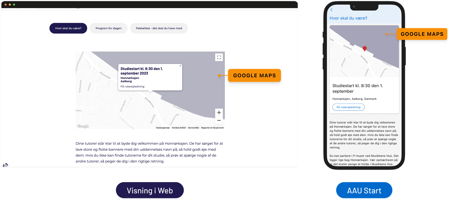 I AAU Start vises Google Maps som en integreret kortvisning med markør og tilhørende information. Modulet bruges til at vise lokationer og give brugeren mulighed for at finde vej direkte fra appen.
