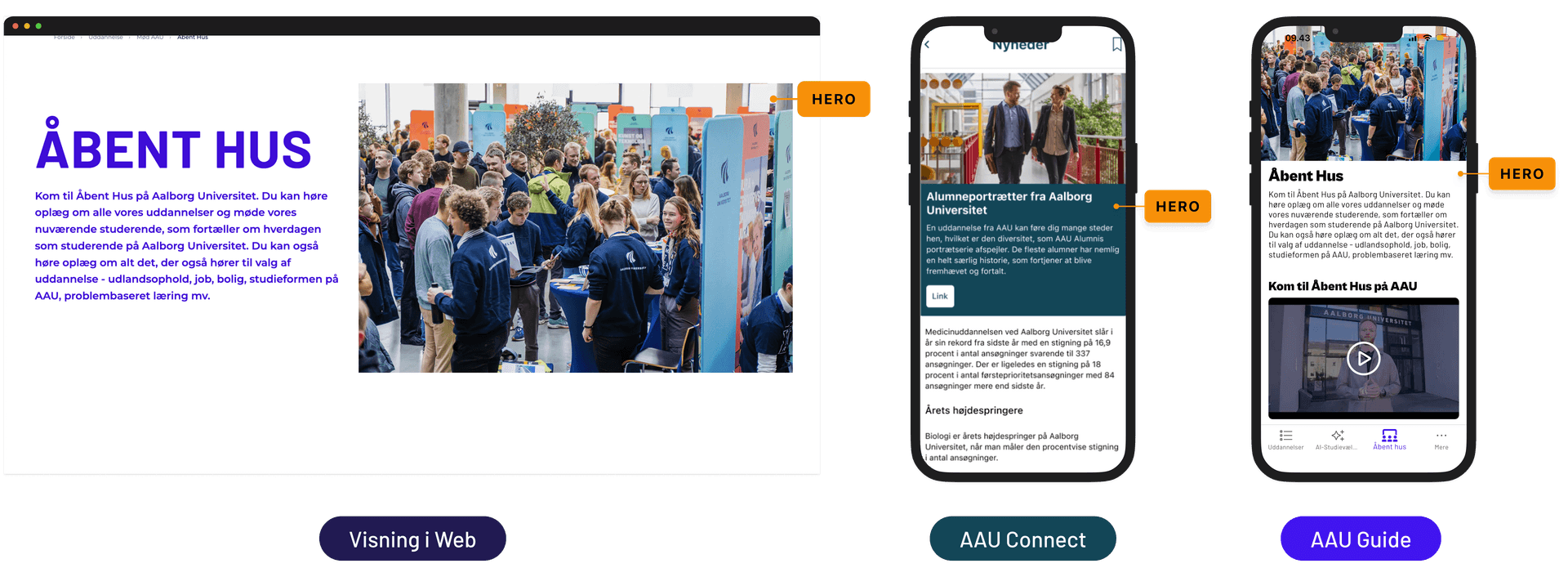 På web vises Hero som et stort introducerende område med billede og tekst. I AAU Connect og AAU Guide vises det tilsvarende som et fremhævet indholdsmodul øverst på siden.