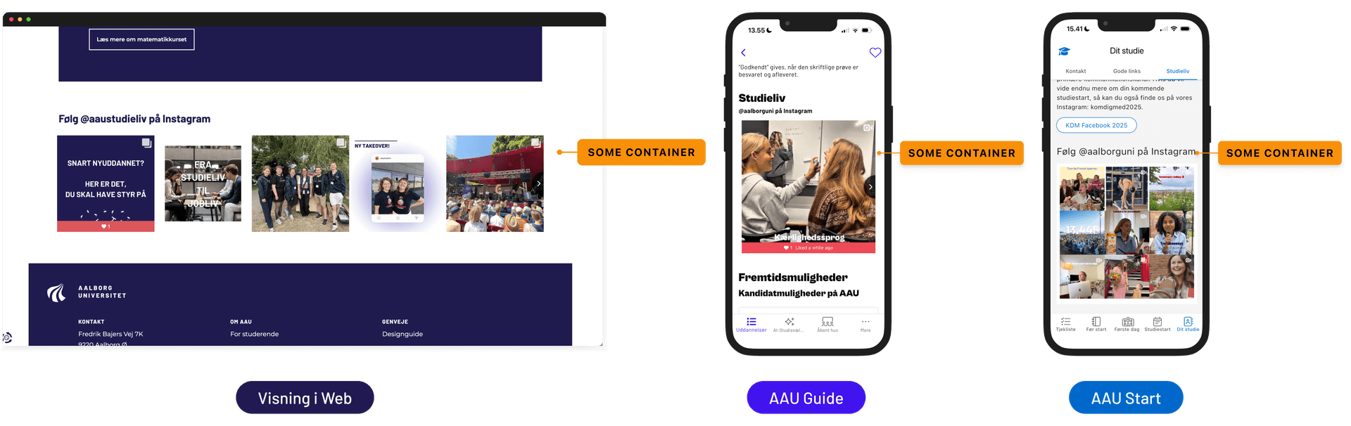 På web vises SoMe Container som en samling af indhold fra sociale medier. I AAU Guide og AAU Start vises det tilsvarende som en feed-lignende visning med opslag og billeder.