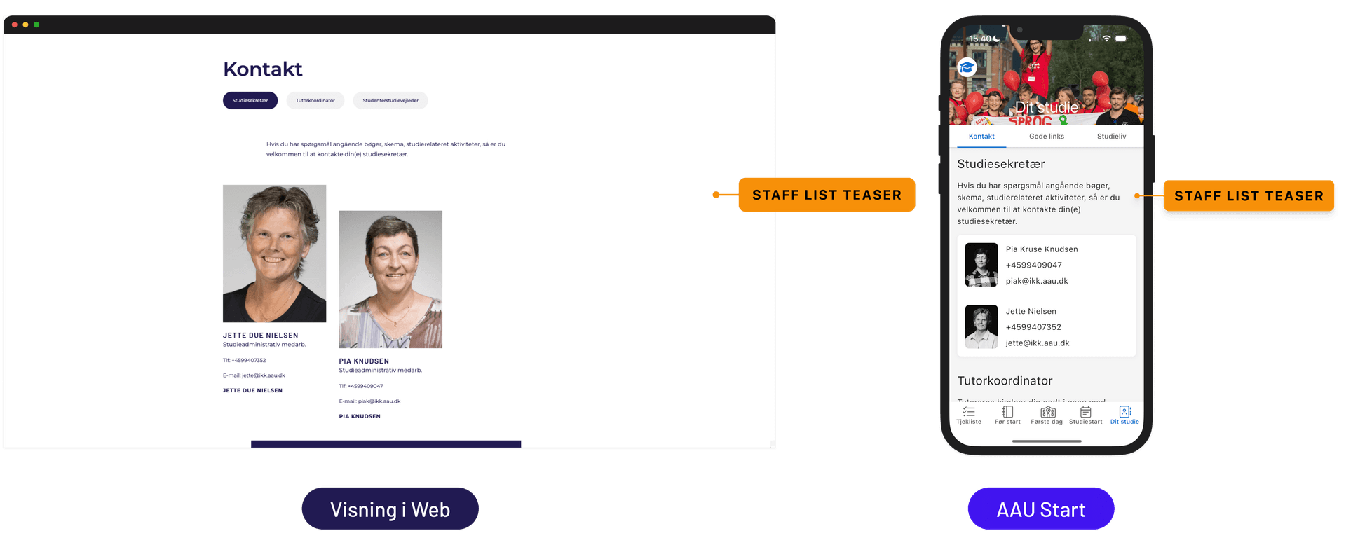 På web vises Staff List Teaser som en præsentation af medarbejdere med navn og kontaktoplysninger. I AAU Start vises det tilsvarende som en liste over medarbejdere i appen.