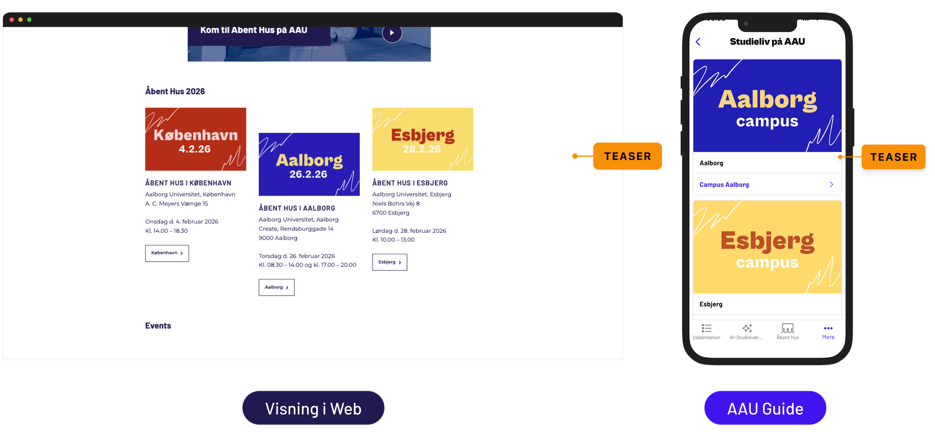 På web vises Teaser som mindre indholdskort med billede og tekst. I AAU Guide vises det tilsvarende som en liste af klikbare elementer.
