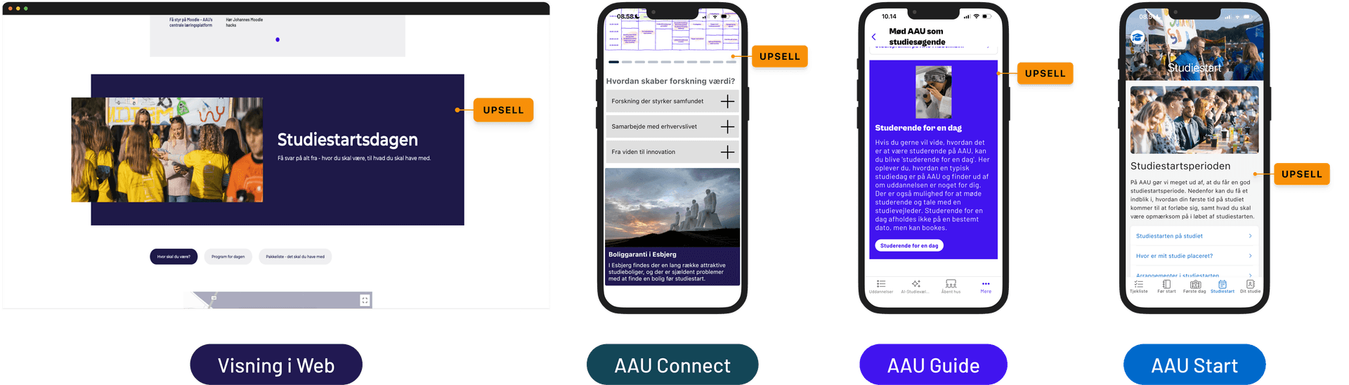 På web vises Upsell som et fremhævet indholdsmodul med fokus på bestemte budskaber. I apps vises det tilsvarende som et visuelt element, der leder brugeren videre til relateret indhold på tværs af AAU Connect, AAU Guide og AAU Start.